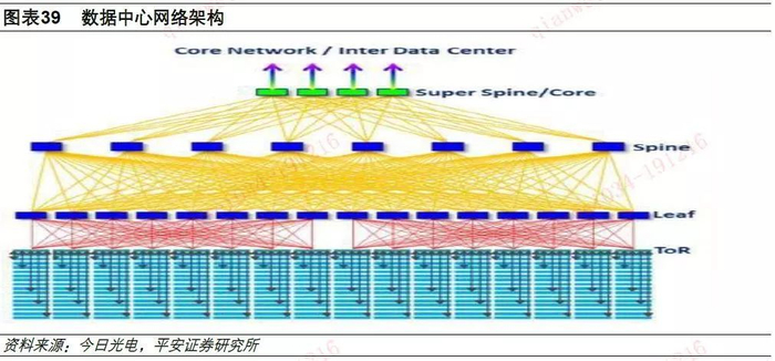 叶脊网络架构扩大了接入和汇聚层,这种网络可以大大提高网络的效率,特别是高性能计算集群或高频流量通信设备的互联网络。随着叶脊网络架构的普及,数据中心的光模块需求将从25/100G向50/200G或者400G升级。