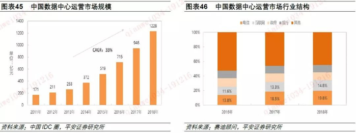 根据中国IDC圈发布的数据显示,2018年中国IDC运营市场规模达到了1228亿元,2011年-2018年的年均复合增速约33%,2014年-2018年年均复合增速36%。