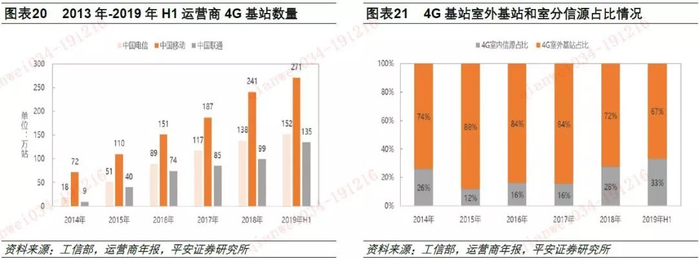 根据工信部发布的统计数据显示,截止2019年H1,三大运营商4G室外基站和室内信源占比分别为67%和33%。以此数据为基础,中国电信拥有大约100万站4G室外基站,中国移动拥有大约180万站4G室外基站,中国联通拥有大约90万站4G室外基站。