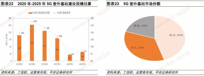 总体来看,2020年中国5G室外基站出货量有望达到100万站。根据4G的市场格局以及行业调研情况,华为和中兴在5G时代的份额分别约为45%和35%,大唐、爱立信以及诺基亚将分享其余20%的份额。