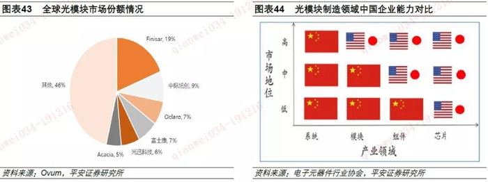 封装制造能力全球领先:依靠工程师红利和长年的经验积累,中际旭创、光迅科技和富士康的光模块产品与国外同行相比,质量领先,价格更便宜,在全球光模块市场的总体占有率达到了22%。