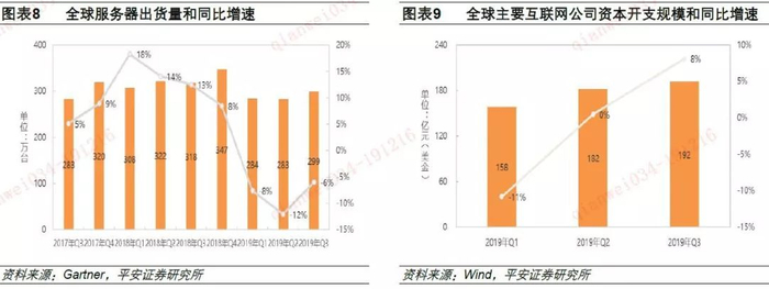 Gartner发布的市场研究数据显示,2019年Q3全球服务器出货量达到299万台,同比降幅约6%,环比Q2的12%有显著收窄;与此同时,谷歌、亚马逊、脸书、微软、阿里巴巴、腾讯和百度等7个全球主要互联网公司在2019年Q3的资本开支规模达到了约192亿美金,同比增长约8%;在经历前两个季度的萎靡后,重新回到了增长态势。