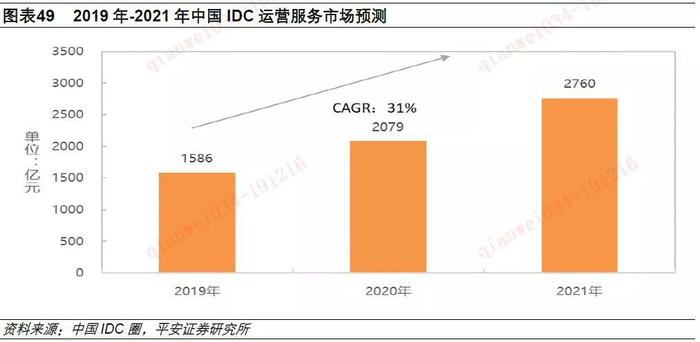 根据中国IDC圈发布的数据显示,2021年中国IDC市场规模将达到2760亿元,2019年-2021年年均复合增速约31%。