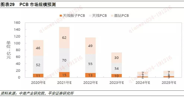 每年PCB市场规模=每年5G室外基站建设量*(每基站单板价格+每基站背板价格+每基站射频价格+每基站天线PCB价格+每基站振子价格)。按照这个公式测算:2020年-2025年,PCB市场总规模约482亿元;天线PCB和基站PCB价值含量较高,占据大约47.1%和41.6%的市场份额。