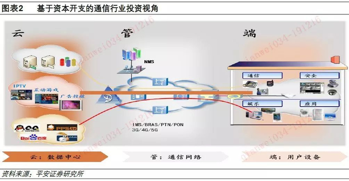 根据功能的不同,宏观意义上的通信网络架构可以分为:数据中心(Internet Data Center,简称IDC)、通信网络和用户设备三个部分。其中:数据中心,主要存放各类互联网应用的内容和数据,投资主要来自云计算公司和各类互联网公司,例如阿里巴巴、腾讯、亚马逊、谷歌等;通信网络,主要负责传送和分发各类内容和数据至用户,投资来自通信运营商例如中国移动、中国电信等;用户设备,主要接收和处理各类内容和数据,包括手机、电脑、电视机等,投资来自消费者自身。通信行业研究的主要对象为数据中心和通信网络的两个部分。