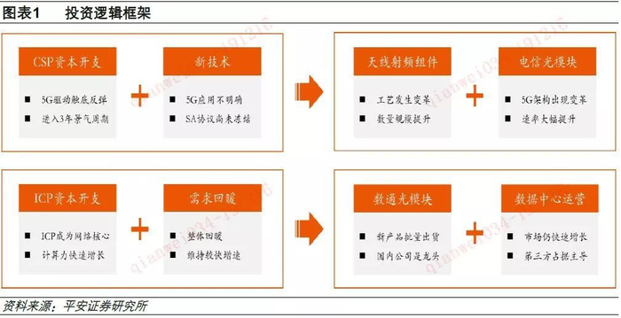 通过分析通信运营商(CSP)和互联网公司(ICP)资本开支现状以及发展趋势,我们认为行业拐点已经来临。在CSP部分,由于5G需求的不确定性,无法带动行业整体进入增长,因此需要关注确定性较强以及盈利能力较强的新技术领域,也就是天线射频组件和电信光模块两个细分领域;在ICP部分,由于互联网公司在通信网络架构中地位逐步提升,资本开支也将回暖并保持增长,可以关注数通光模块部分和数据中心运营部分。