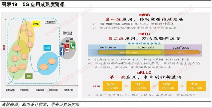 5G应用方面,我们认为eMBB场景的应用将率先成熟,高清视频、VR/AR等大带宽业务开始通过5G系统来承载;mMTC场景的应用,随着NB-IoT和eMTC技术的演进成熟,预计在2023年开始得到部署和推广;uRLLC场景由于受到标准、芯片、终端以及生态多方面因素的影响,预计要在2025年左右才会有大规模部署应用。