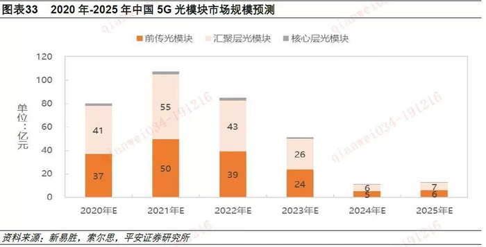 每年光模块市场规模=每年5G室外基站建设量*(12*前传光模块单价+2*汇聚层光模块单价+1/25*回传光模块单价)。按照这个公式测算:2020年-2025年,光模块市场总规模约347亿元。前传和汇聚层光模块占据大约46.2%和51.4%的市场份额。
