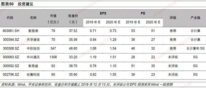聚焦行业龙头及其供应商:对于投资方向,我们建议关注新技术导入以及上游资本开支增长带来的结构性机会。新技术导入方面,主要涉及5G移动通信系统中的天线射频和光模块两个细分领域;上游资本开支方面,主要涉及数据中心光模块和数据中心运营市场两个细分领域。2020年,5G移动通信网络将进入全面大规模部署时期,主设备商将首先受益;主设备商的光模块和射频组件供应商也将受益。