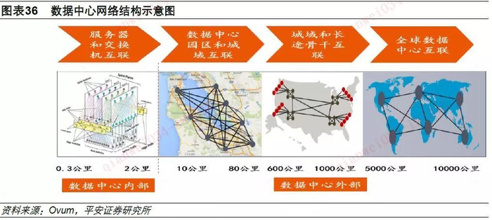 从连接距离来看,数据中心网络结构可以分为服务器和交换机互联、数据中心园区和城域网互联、城域和长途骨干互联以及全球数据中心互联等4部分。从需求来看,云计算公司是主要需求方,对于全球性的云计算公司,需要将其分布在在全球各个区域的数据中心以及数据中心园区连接起来。
