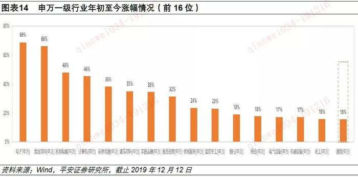 截止2019年12月12日,申万通信行业指数年初至今涨幅约16%,在申万28个一级行业指数中,排名处于第16位。沪深300、中小板指、创业板指涨幅分别为29%、32%和38%,大幅领先申万通信行业指数涨幅。