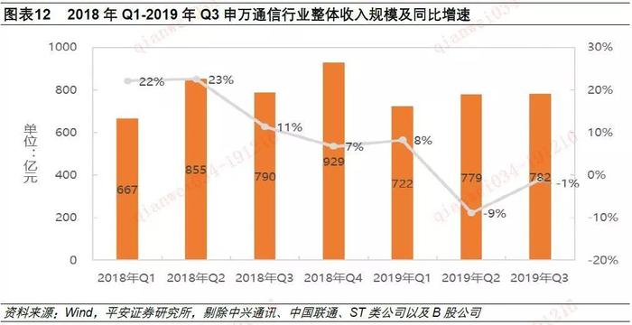 虽然运营商资本开支规模在2019年实现了触底反弹,但是通信行业(申万通信)整体收入规模未出现大幅提升。在剔除中兴通讯、中国联通、ST类公司以及B股公司后,2019年前三季度,通信行业整体收入规模约2283亿元,同比上年同期的2312亿元,呈小幅下降态势。Q3单季度,通信行业整体收入同比仍处于下降态势,但降幅有所收窄。我们预计,2019年全年收入规模最多与2018年的3241亿元持平。