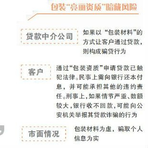 “包装材料为虚,骗取个人信息为实。”对于市面上许多打着“资质包装申请贷款”旗号的贷款中介,一位业内资深人士如此评价道。事实上,此前也曾有一些用户遭遇贷款中介的所谓“包装”骗局,一些用户被骗去了服务费,还有一些用户因为个人信息被泄露,而莫名背上多笔贷款。另外,还有一些不法贷款中介会利用客户信息向小贷公司、网贷机构申请高息贷款。业内人士评价,即便少数人通过包装贷款成功,也改变不了骗贷的本质。一经查出,不仅会被列入银行黑名单、收回贷款,还有可能与贷款中介一起触犯《刑法》。