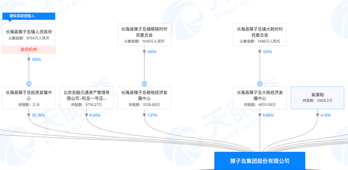 天眼查显示,现在獐子岛第一大股东长海县獐子岛投资发展中心目前持股比例30.76%,其背后是长海县獐子岛镇人民政府。