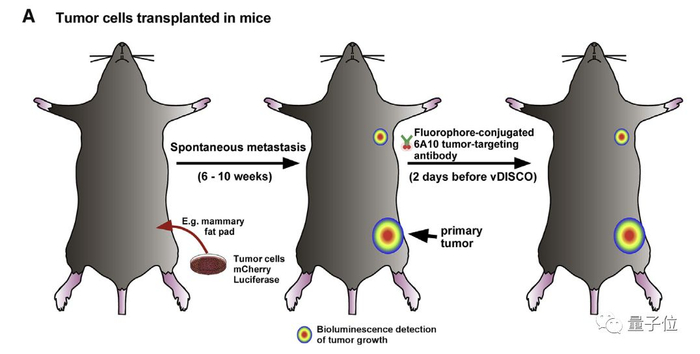 第一步,是通过vDISCO方法,把癌细胞的荧光蛋白信号增强100倍以上。