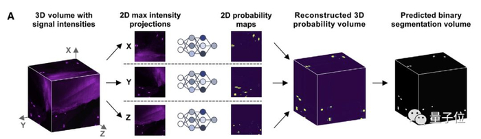首先,导出每个子体积的三个2D最大强度投影(与x轴、y轴和z轴对齐),增强信噪比。