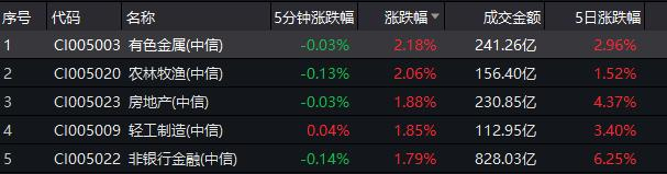 板块方面来看,有色、农林牧渔、房地产、轻工制造、非银金融等表现领先。