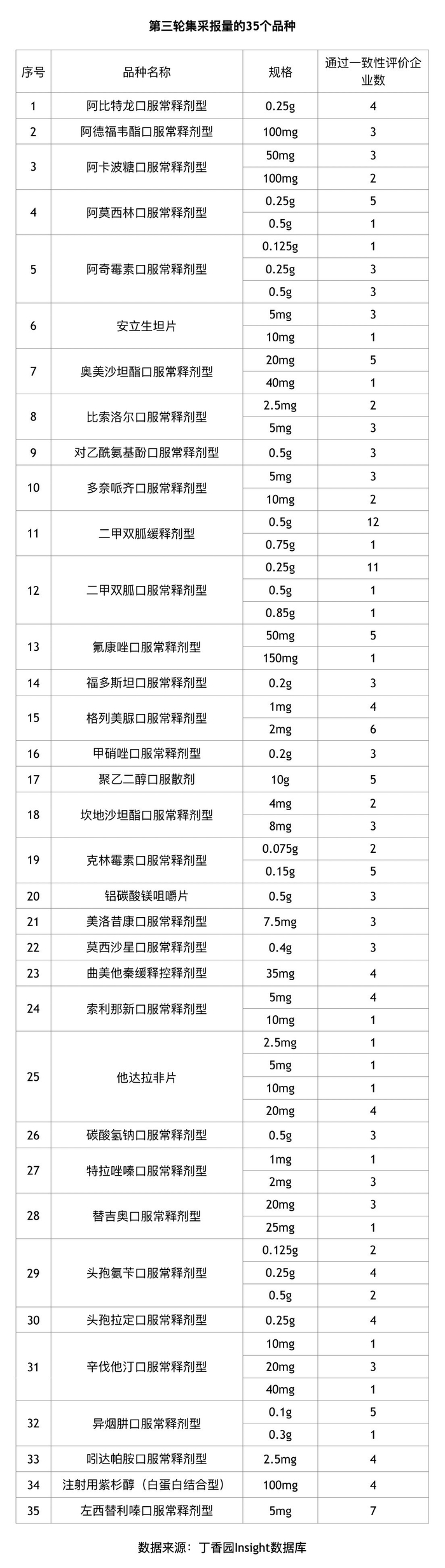 本轮采购35个品种共涉及118家企业。包括阿卡波糖、二甲双胍等大品种,除了注射用紫杉醇(白蛋白结合型)外,其余均为口服剂型。新京报记者查询丁香园Insight数据库发现,二甲双胍缓释剂型竞争最为激烈,0.5g品规通过/视同通过一致性评价企业多达11家,包括正大天晴、石药集团欧意药业等,但0.75g品规只有石药集团欧意药业一家。