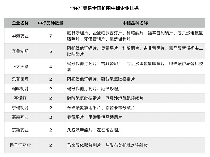 其中,华海药业凭借厄贝沙坦片、盐酸帕罗西汀片、利培酮片、福辛普利钠片、厄贝沙坦氢氯噻嗪片、赖诺普利片、氯沙坦钾片7个产品的中标,继“4+7”试点后,再次成为中标品种最多的企业。齐鲁制药、正大天晴紧随其后。