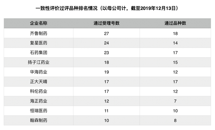 新京报记者根据同花顺和公开数据,梳理了截至2019年12月13日企业一致性评价过评品种排名情况,以母公司计算,按照通过品种排名,齐鲁制药、石药集团、正大天晴排名前三。
