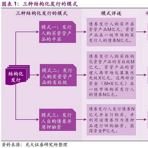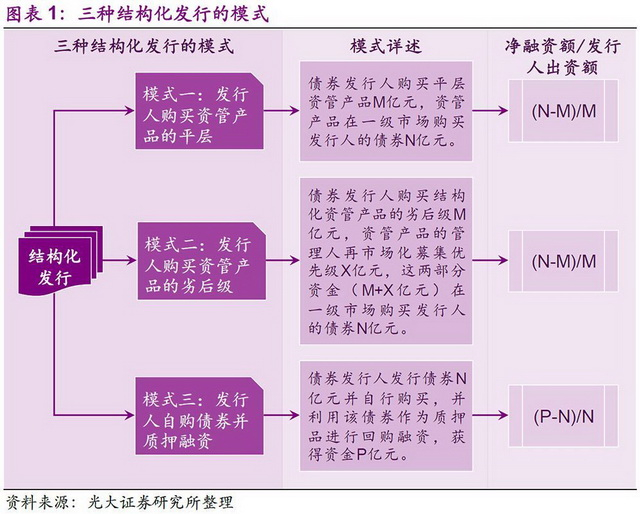 记者了解到,债券结构化发行主要有三种形式:第一种为发行人购买资管产品的劣后级,该资管产品的管理人再市场化募集优先级,两部分资金用于在一级市场购买发行人的债券;第二种为发行人购买资管产品的平层,即发行人通过购买平层资管产品,由后者购买其发行的部分债券;第三种为发行人自购债券并质押融资,其本质为使用债券回购融资代替债券发行融资。