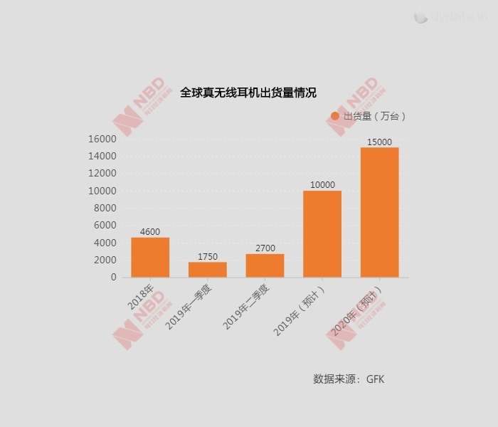根据GFK的数据,2018年全球TWS耳机出货量达到4600万台,2019年一季度TWS耳机出货量为1750万台,随着第二季度TWS耳机出货量提升到2700万台,全年预计是1亿台以上,2020年则预计将有1.5亿台。