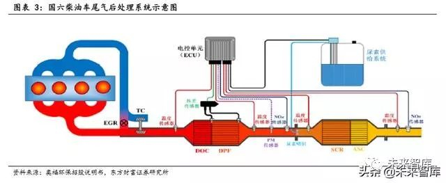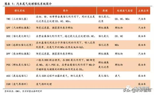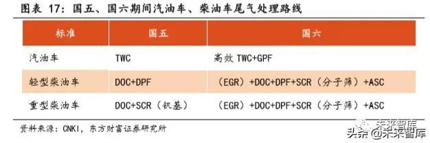 国五期间,汽油车常用尾气处理路线为 TWC 三效催化器,柴油车一般采 用 DOC+SCR 或 DOC+DPF。为应对国六更为严苛的标准,汽油车需要使用更为 高效的 TWC,并同时加装单独的 GPF。柴油车对氮氧化物的控制更为严苛, 通常需采用 EGR+DOC+SCR+DPF+ASC 或 DOC+高效 SCR+DPF+ASC 路线。
