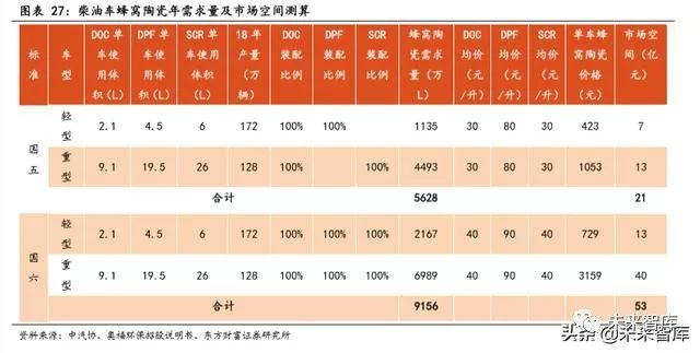 柴油车:假设国五阶段轻型柴油车采用 DOC+DPF 路线(DOC、DPF 装配率 100%) ,重型柴油车采用 DOC+SCR 路线(DOC、SCR 装配率 100%)。假设国六 阶段柴油车全部采用 DOC+DPF+SCR 路线,DOC、DPF、SCR 装配率均为 100%。以 2018 年轻型、重型柴油车产量为基数,测算得出柴油车国六阶段蜂窝陶 瓷需求量为 9156 万升,较国五阶段提升 62.7%。假设国五、国六阶段 SCR (DOC 价格基本相同)均价分别为 30、40 元/升,DPF 均价分别为 80、90 元 /升,测算得出柴油车国六阶段蜂窝陶瓷市场空间为 53 亿元,为国五期间的 2.6 倍。