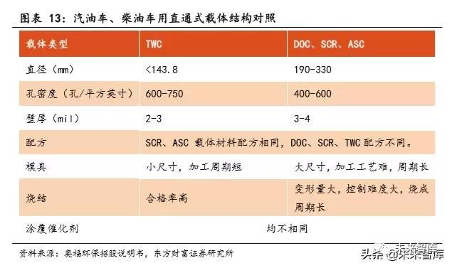 基于历史原因,我国柴油机国产化程度较高,潍柴、玉柴、江铃、云内 动力、锡柴等自主品牌占据了大部分市场,也为汽车催化材料国产化提供了 良好环境。柴油车用 SCR、DOC、DPF 蜂窝陶瓷体积较大,壁厚相对较厚,对 薄壁化要求相对较低,但对挤出成型和烧结工艺均匀性要求较高,国内蜂窝 陶瓷企业在柴油车蜂窝陶瓷领域与国外企业技术差异较小。主要的蜂窝陶瓷 企业一般已与下游一家或多家主机厂商形成长期稳定合作,在柴油车蜂窝陶 瓷领域渗透率相对较高。预计随着国六标准推行,国产材料厂商有望凭借成 本优势和客户优势在柴油车用蜂窝陶瓷领域获得快速增长。