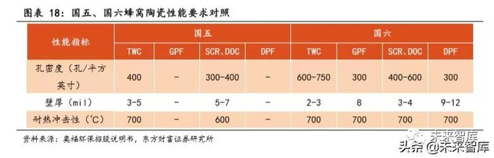 国六标准实施后,相比国五阶段,GPF 需求将实现从无到有,SCR、DPF、 ASC 加装率将大幅提升。同时由于国六产品对孔密度、壁厚、热稳定性等性 能要求更高,预计单价将有所提升。