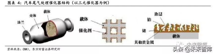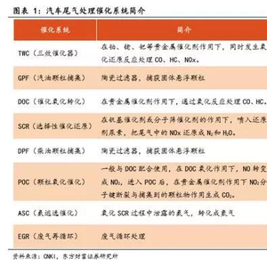 具体来看,TWC 催化剂:采用铂铑钯三种活性组分同时处理 HC、CO、NOx, 以氧化铝作为分散载体,以铈锆固溶体作为助剂提高活性组分活性、增强抗 毒能力。DOC 催化剂:用于柴油车氧化催化,活性组分仅需铂、钯单独或配合使用。SCR 催化剂:用于柴油车 NOx 还原处理,目前应用较多的催化剂包 括包括 V2O5-WO3/TiO2催化剂,以及负载 Cu 或 Fe 的分子筛催化剂。ASC 催化 剂:用于氧化 SCR 处理过程中逸出的 NH3,典型的 ASC 催化剂包括顶部催化 剂层(包含常规 SCR 催化剂)和底部催化剂层(氨氧化催化剂,例如铂/钯氧化铝)。GPF、DPF 催化剂:用于汽油车、柴油车悬浮颗粒物捕集,一般选 用壁流式蜂窝陶瓷作为载体,尾气通过蜂窝陶瓷壁毛细孔道实现颗粒物过滤。多数 GPF、DPF 仍需要涂覆铂/钯-氧化铝涂层,以实现碳烟颗粒氧化,延长 清洗再升周期。