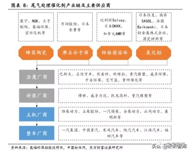 催化材料的下游直接使用方为催化剂涂覆厂商,目前汽车尾气催化器领 域形成了较为成熟的寡头垄断格局,巴斯夫(BASF)、庄信万丰(Johnson Matthey)、优美科(Umicore)占据了全球超过 70%的市场份额。国内厂商有 威孚环保、中自环保、重汽橡塑等厂家。涂覆、封装完成的催化器终端客户 为主机厂商或整车厂商(部分 DPF、GPF 无需涂覆,直接送至封装厂商进行 封装),在产业供应链中,针对核心的蜂窝陶瓷等催化材料,主机厂商或整 车厂商一般会指定到专门的材料供应商。