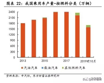 2018 年我国汽油车产量为 2326.18 万辆,其中乘用车 2218.35 万辆,商 用车 107.83 万辆。柴油车产量 300.39 万辆,商用柴油车中,中、重型货车 及大中型客车占比为 43.4%,由此估算,2018 年国内重型柴油车产量约为 128 万辆,轻型柴油车产量约为 172 万辆。