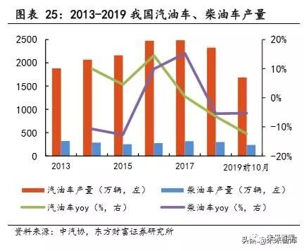 近两年车企产销整体承压,汽油车、柴油车产量均不同程度下滑。但我 们预计促进汽车消费政策的出台以及国五切换国六的影响减弱后,汽车产销 预计将企稳回升。谨慎起见,我们保守假设 2019-2021 年汽车产量零增长, 以 2018 年产量数据进行未来三年需求测算。