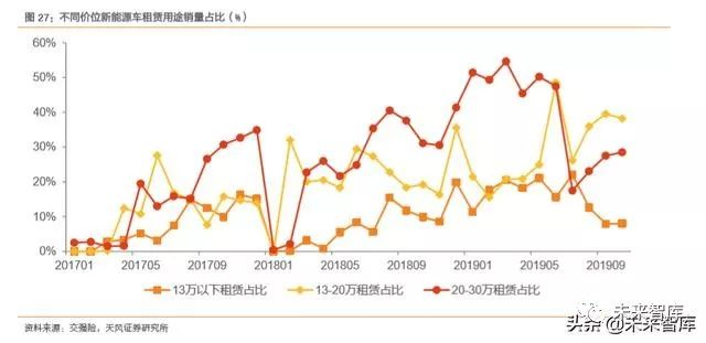 中低端新能源车运营化趋势明显。13 万以下车型的租赁用途占比在 30 万元以下车型中最 低,且在补贴退坡后下降明显,有明显的“抢装”特性。而 23-20 万及 20-30 万的车型在 租赁市场具备明显的成长属性,其租赁销量占比一路上升,在 19 年上半年甚至高达 50%。15 年起,广深、佛山、昆明、太原、大连、沈阳、郑州陆续出台措施加快网约车、出租车的电动化。网约车、出租车市场为中低端新能源市场的重要需求来源,新增网约车与燃油 出租车、公务用车的存量替代也为其重要的增长驱动点。