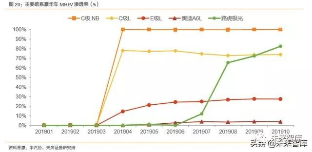 欧系豪车多使用 48V 微混技术以实现节油。中国市场上,拥有 48V MHEV 版的欧系豪华车 主要有:奔驰 C 级、奔驰 E 级、奔驰 S 级;奥迪 A6L 等,车型上市后渗透率不断提升,豪 华车部分 MHEV 化趋势不断强化。其中奔驰 C 级、E 级微混版均于 2019 年 4 月上市,上 市以来,C 级里 MHEV 版渗透率跳升至 80%以上,E 级的 MHEV 版渗透率也逐渐爬升至 10 月的 27.4%。