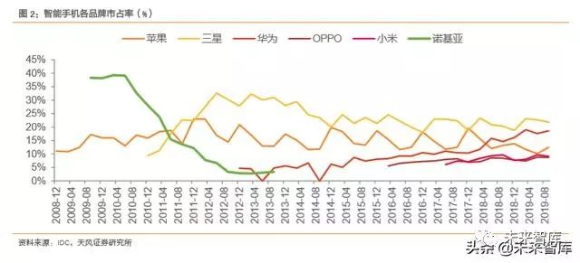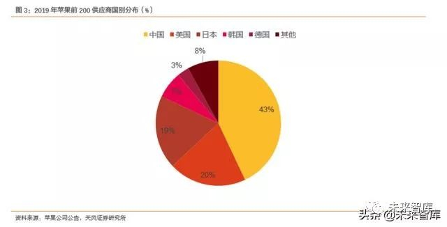 苹果的崛起扶持了一大批中国手机供应商。根据苹果披露的 2019 苹果全球 200 大供应商 名录,中国供应商占到 86 家,占比 43%,而苹果在 2012 年首次披露的 156 家供应商名单 中仅 8 家来自中国,中国企业所得利润仅占单台手机利润 2%。中国手机产业链的崛起间接 推动了中国手机品牌后起之秀华为、OPPO、小米在手机行业的发展壮大,目前其份额逐 渐接近甚至超越了苹果。