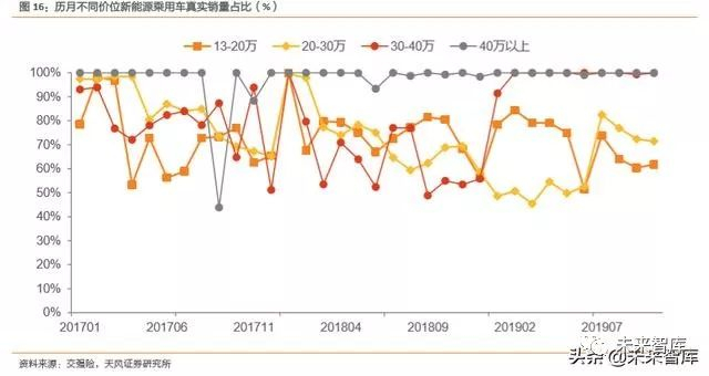 新能源车型越高端,销售真实性越高。从不同价位的新能源车真实销量占比可看出,30-40 万及 40 万以上的新能源车型真实销量占比都在 19 年维持了 100%,而 13-20 万、20-30 万的新能源车真实销量占比在 50%-80%之间波动,且同样体现了随抢装节奏波动的特征。