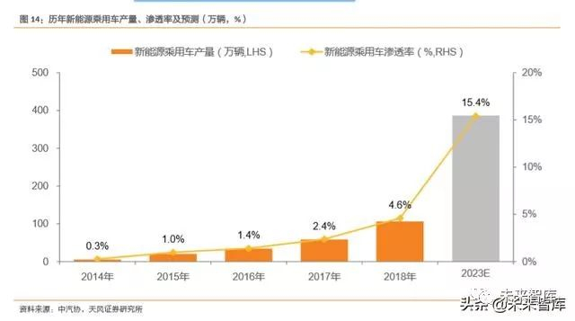 产量端:双积分政策对新能源车产量与车企平均油耗做出了严格的规划,基于此,我们测算了 19-23 年中国车企达标双积分考核下的新能源汽车托底产量,预计到 2023 年,车企 为双积分达标所需新能源车产量至少约为 386 万辆,对应中国新能源乘用车渗透率从 18 年的 4.6%上升至 2023 年的 15.4%(以 2023 年乘用车销量为 2500 万辆作为假设),18-23 年预计新能源乘用车产量复合增长率约 30%。