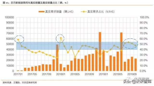 新能源车真实需求假设下,2019 年 1-10 月真实销量累计值为 30 万辆,真实销量占比主 要在 40-55%之间波动,补贴抢装期间真实销量占比较低,补贴退坡后的月份真实销量占 比往往很高(2017 年 1 月、2018 年 1 月、2019 年 7-10 月),且随着补贴退坡进程加速, 真实需求占比中枢也在逐步抬升,体现新能源汽车销售质量的逐步提高。