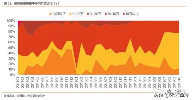 13-20 万为运营车型核心价格带。30 万元以下的新能源车型因其使用经济性而成为运营车 辆租赁公司、滴滴车主等的选择。补贴的大幅退坡使得 13 万元以下车型相对燃油车的价 格优势丧失,产品力也不足以与同级别燃油车抗衡,续航、性能也不适合作为网约车使用, 其在租赁用途车型销量中的占比从 17 年 10 月的 39.4%下降到 19 年 10 月的 13.4%。13-20 万的车型逐渐成为租赁用途车型核心价格带,19 年以来,其在租赁销量中的份额迅速上升 至 65%左右,19 年 8-10 月这一占比的调升主要归功于北汽 EU5 EV 和 Aion S EV 的上量。