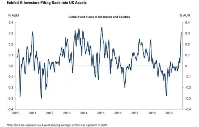 针对上述图表,高盛表示英国退欧协议的进展导致英镑在10月份大幅上涨,这可能是由于真正的货币投资者进行了空头回补。他们补充称如果英国大选结果为退欧进程指明了明确的前进道路,英镑将成为其2020年第一季度的最青睐的货币之一。