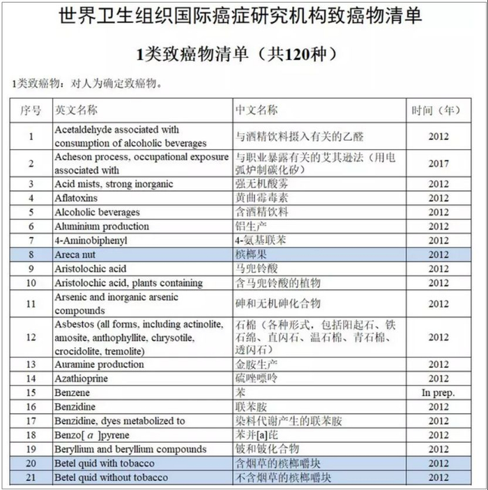 早在2003年,世界卫生组织就把槟榔列入一级致癌物清单。2017年,国际癌症研究机构公布120种1类致癌物清单,与槟榔相关的致癌物,占据其中3种。