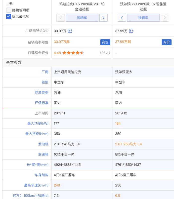 沃尔沃2020款S60的售价区间为28.69万~46.19万元,价格整体比CT5高,尺寸方面,CT5也更有优势。但从动力上来看,凯迪拉克CT5全系使用了统一的发动机与变速箱,沃尔沃2020款S60部分车型的性能则更胜一筹。