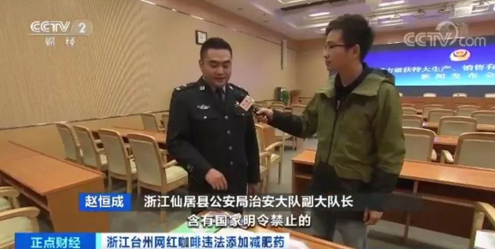 浙江仙居县公安局治安大队副大队长 赵恒成:这些东西我们检测出来含有国家明令禁止的“西布曲明”和“酚酞”,吃下去之后会感到头昏、恶心、呕吐,过量摄入之后会造成生命危险。