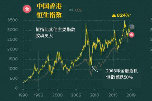 中国香港恒指斩获了亚军宝座。数据发现,过去30年恒生指数上涨幅度达824%。