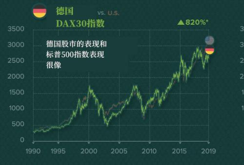 紧随其后的是德国DAX指数,近30年上涨了820%。