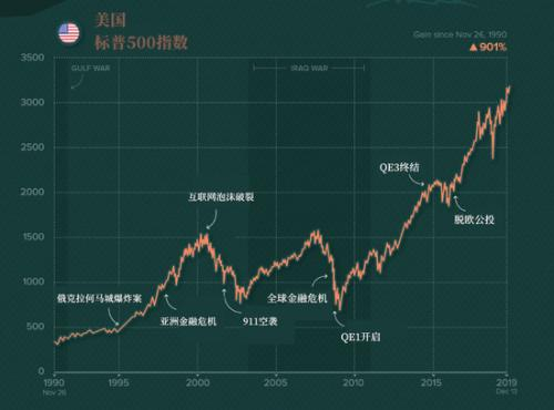毫无悬念,表现最好的股指是标普500指数。1990年11月26日,标普500指数为316.5,当前标普500指数已经站稳在3170附近(以11月26日的收盘价为基准),这30年的涨幅达901%。也就是说,如果当年的你独具慧眼,在美股投资了100美元,那么今天的价值就已经超过了1000美元。