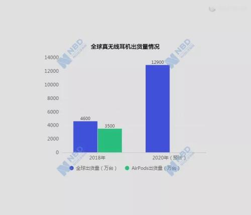 根据Counterpoint Research数据,2018年全球真无线耳机出货量约4600万台,其中AirPods出货量约3500万台,约占全球整体出货量的3/4。随着真无线设备在全球智能手机用户中的渗透率持续增长,到2020年, Counterpoint Research预计全球真无线耳机市场出货量将达到1.29亿台。