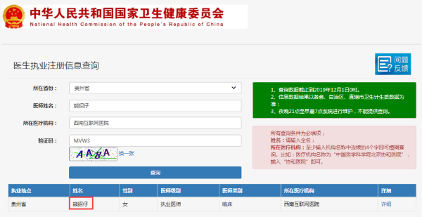 医师执业信息查询结果(来源:中华人民共和国卫生健康委员会)